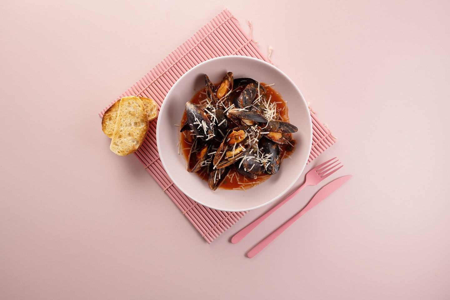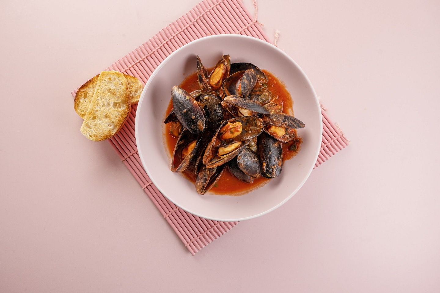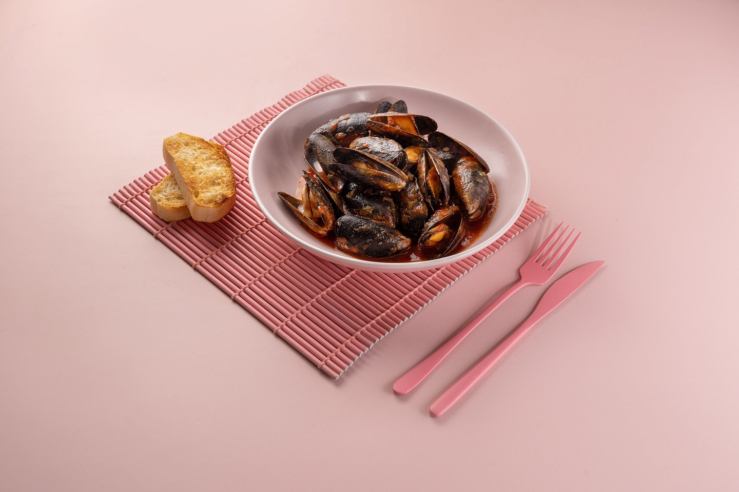 Вес: 330 гр Состав: мидии, томатный соус, базилик, чиабатта