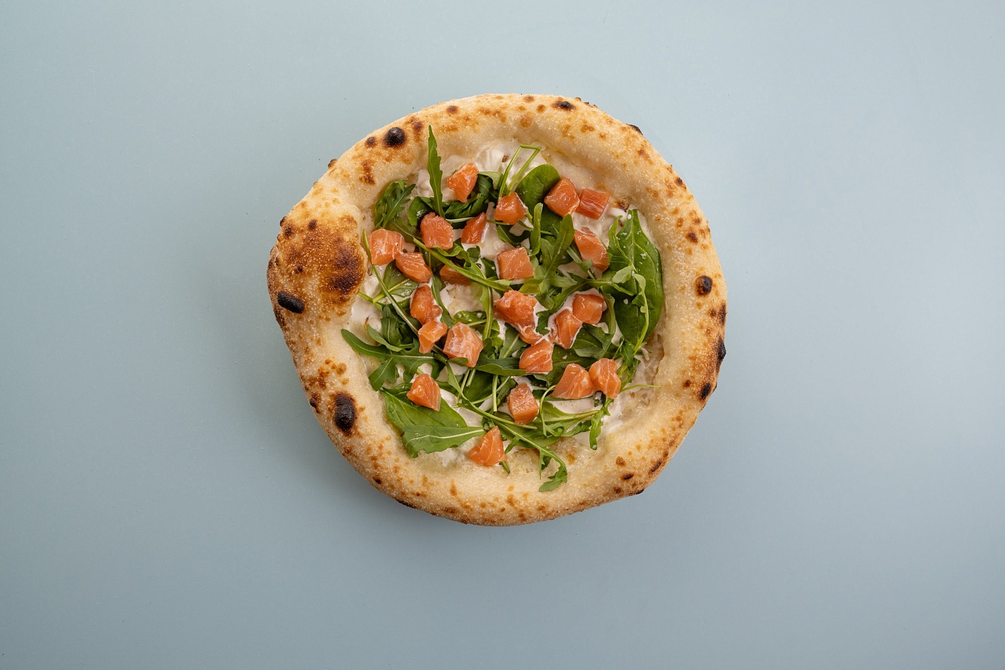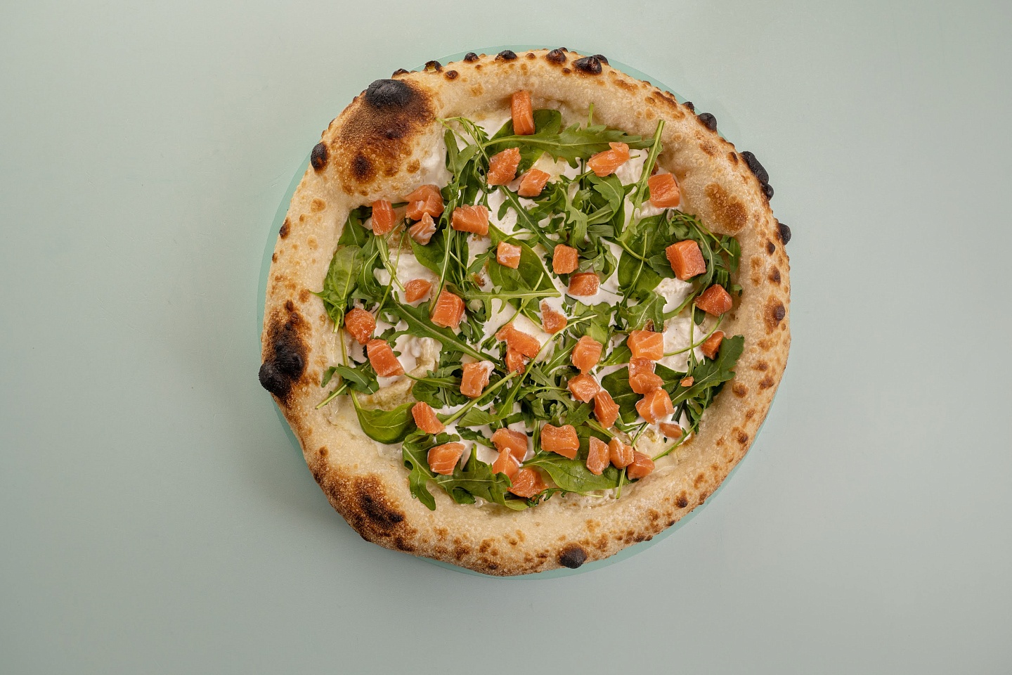Вес: 400 гр Состав: тесто для пиццы, сливочный соус, лосось, страчателла, моцарелла, рукола, шпинат