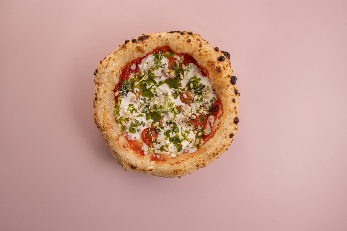 Вес: 500 гр Состав: тесто для пиццы, томатный соус, моцарелла, страчателла, томаты черри, песто, кедровые орехи