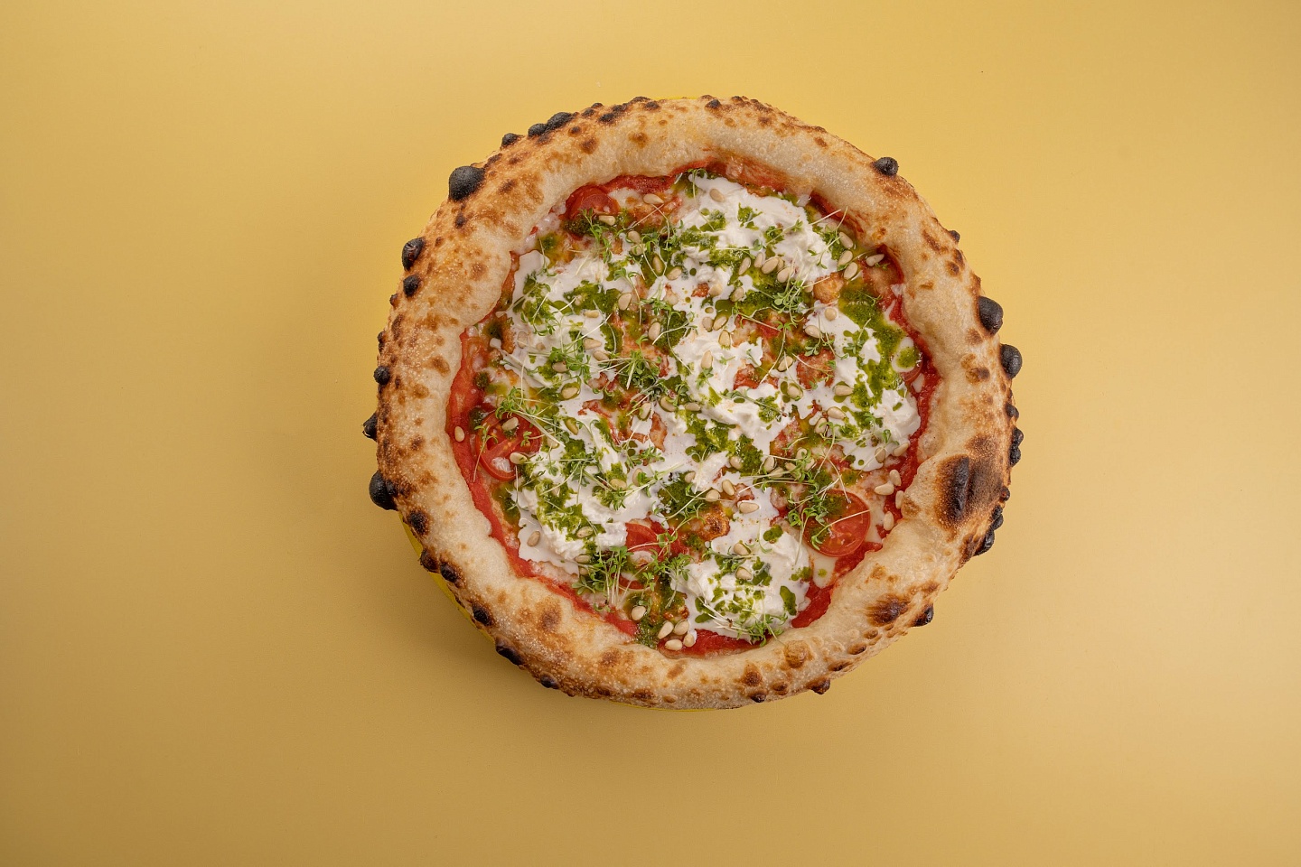 Вес: 300 гр Состав: тесто для пиццы, томатный соус, моцарелла, страчателла, томаты черри, песто, кедровые орехи