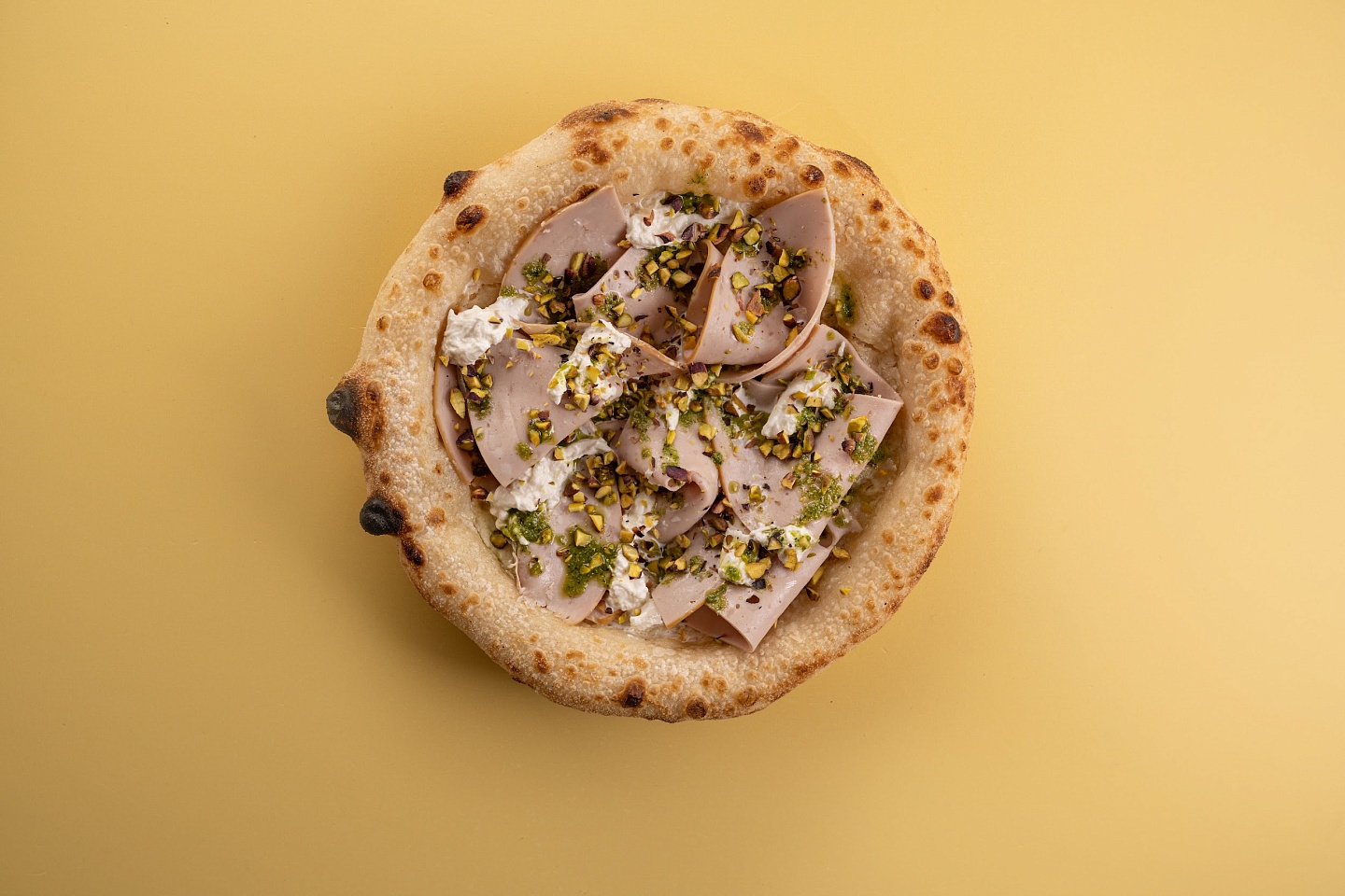 Вес: 370 гр Состав: тесто для пиццы, мортаделла, страчателла, соус песто, фисташки