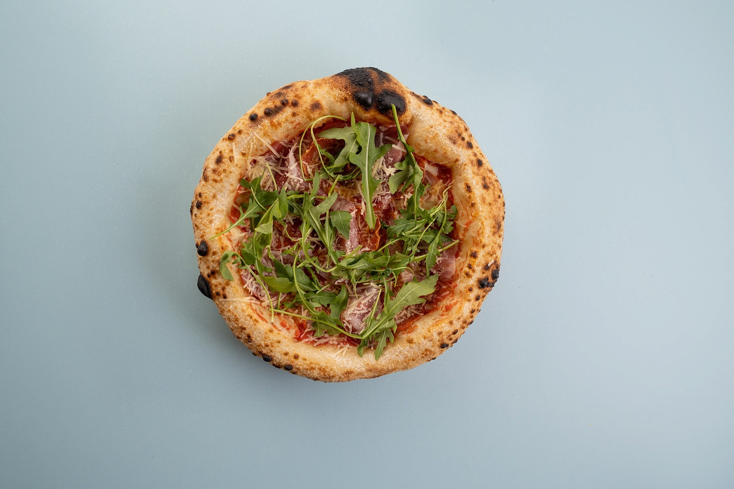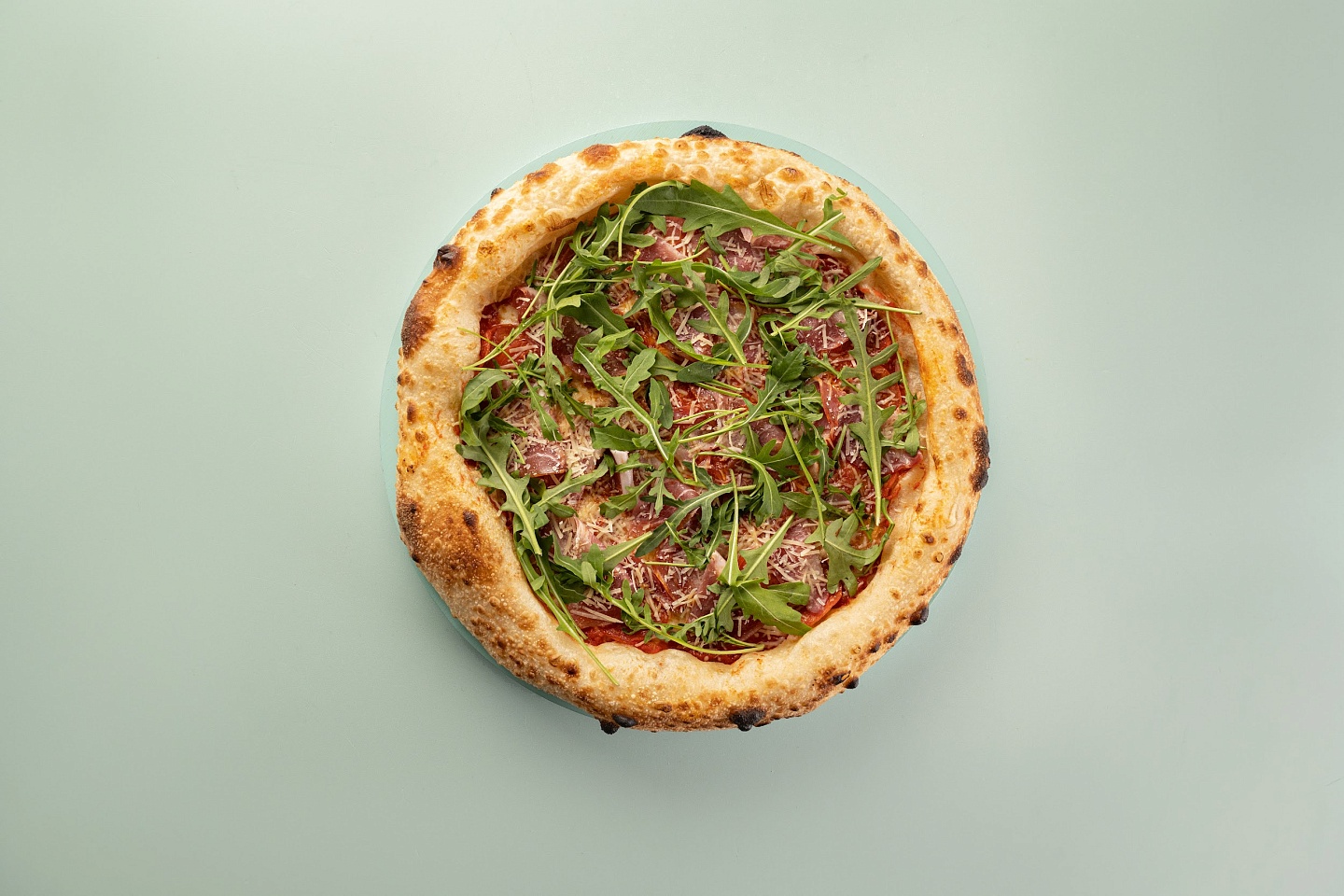 Вес: 500 гр Состав: тесто для пиццы, томатный соус, моцарелла, копа, пепперони, бекон, томаты черри, пармезан, рукола