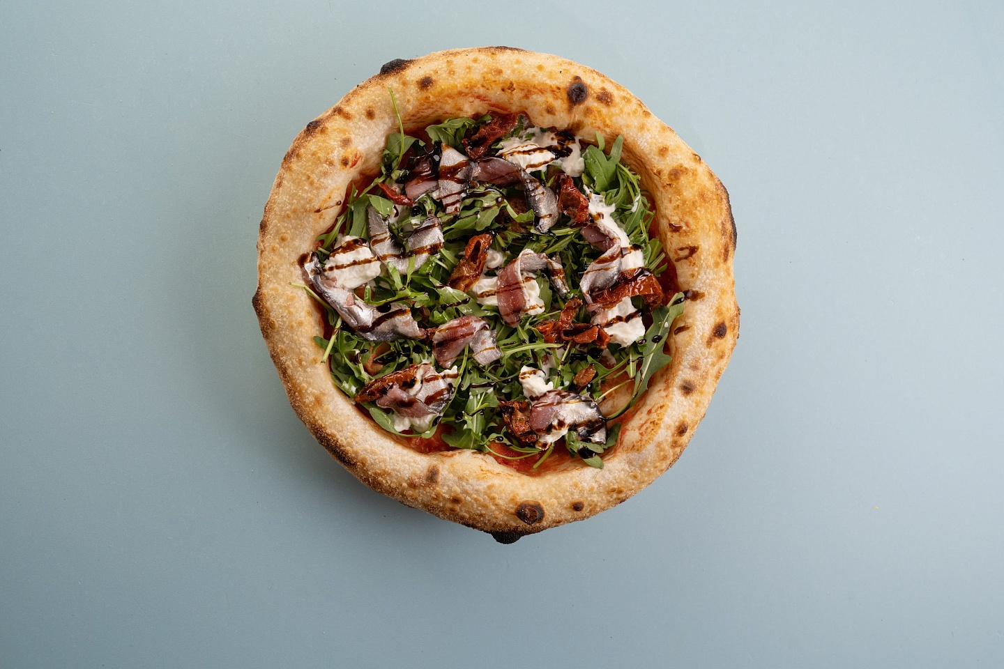 Вес: 320 гр Состав: тесто для пиццы, томатный соус, анчоусы, сливки, руккола, томаты вяленные, бальзамик
