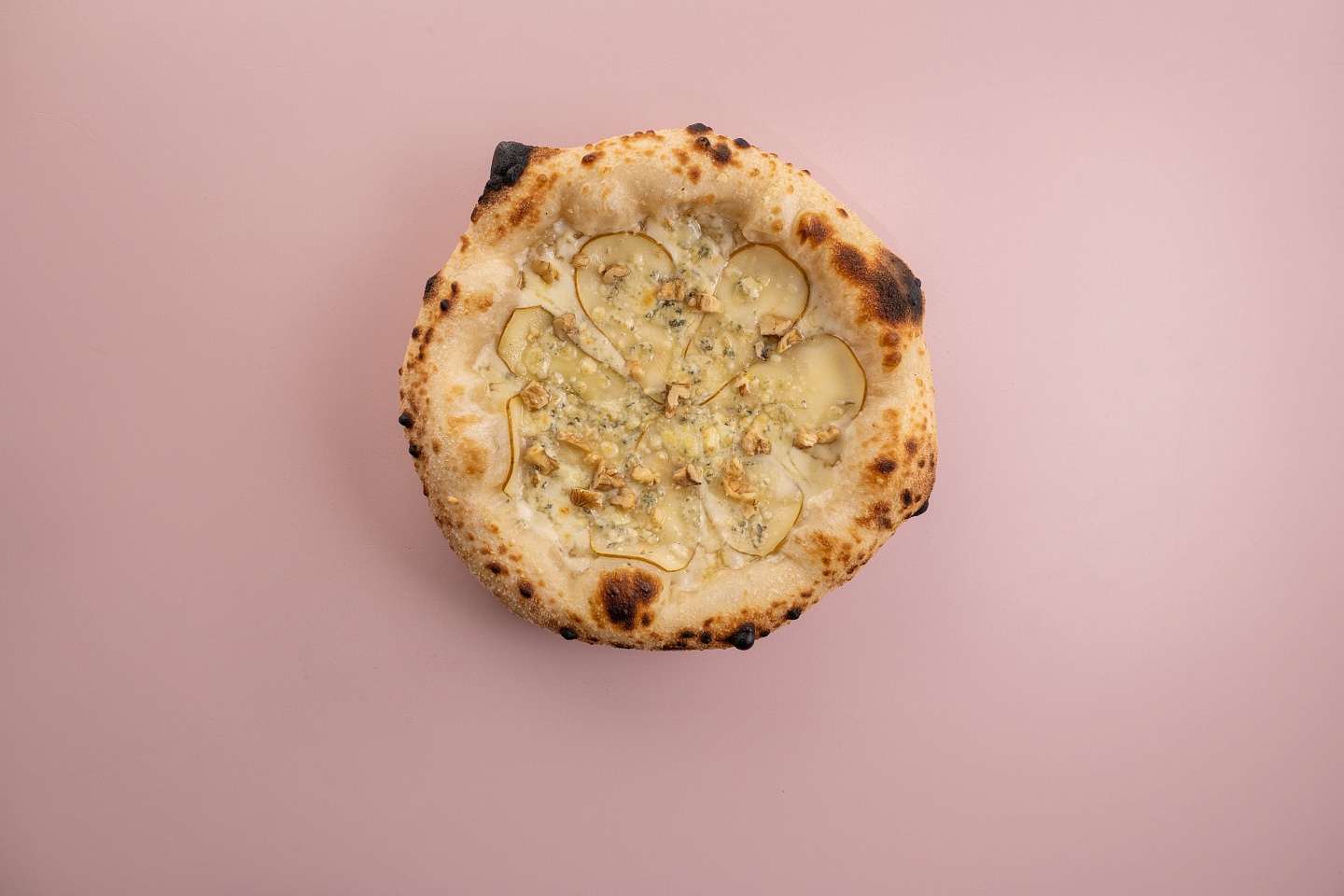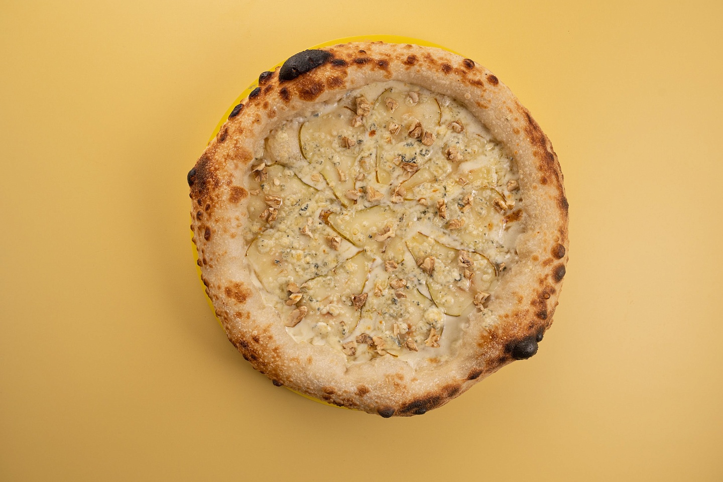 Вес: 550 гр Состав: тесто для пиццы, сливочный соус, моцарелла, груша, дорблю, грецкий орех, мед