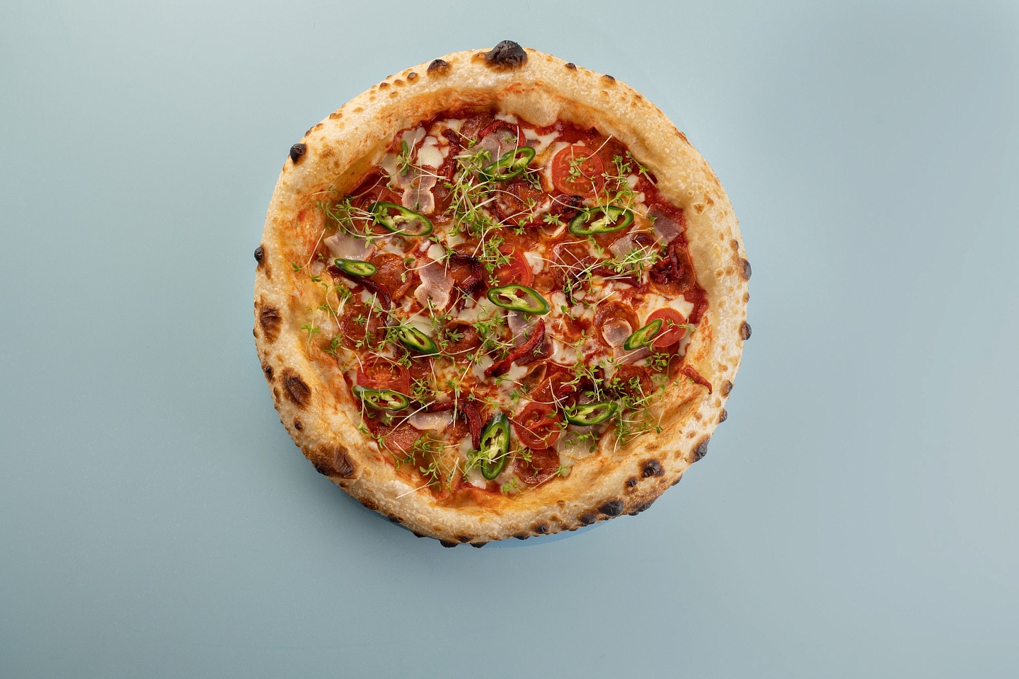 Вес: 550 гр Состав: тесто для пиццы, острый томатный соус, моцарелла, болгарский перец, чоризо, бекон, зеленый острый перец, томаты черри