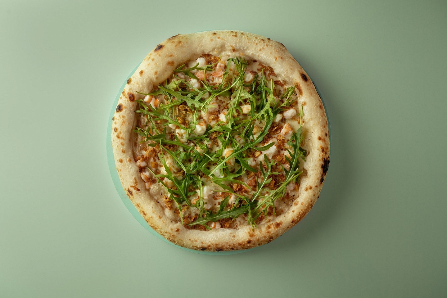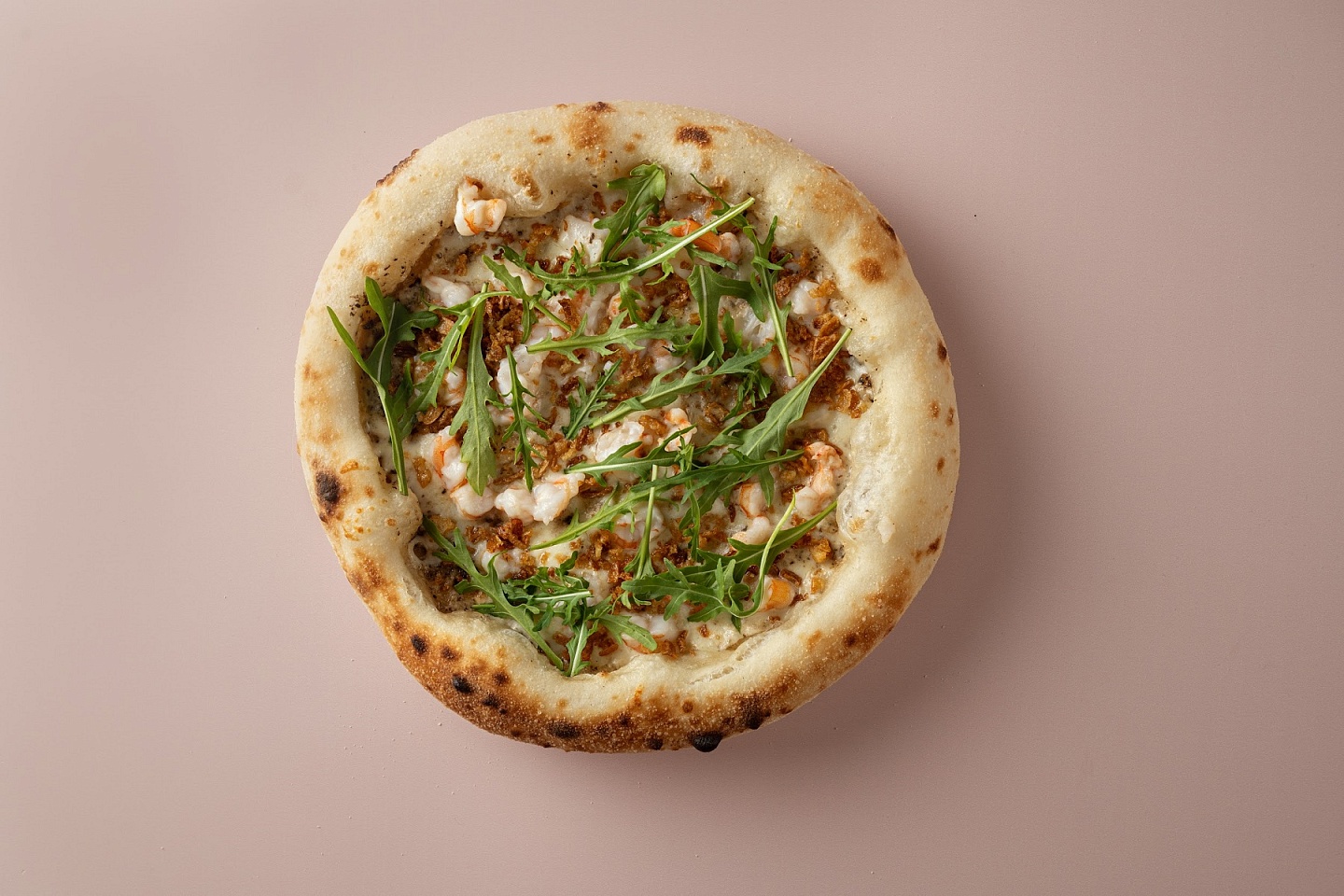 Вес: 500 гр Состав: тесто для пиццы, сливочный соус, моцарелла, креветки, трюфельная паста, лук криспи, руккола