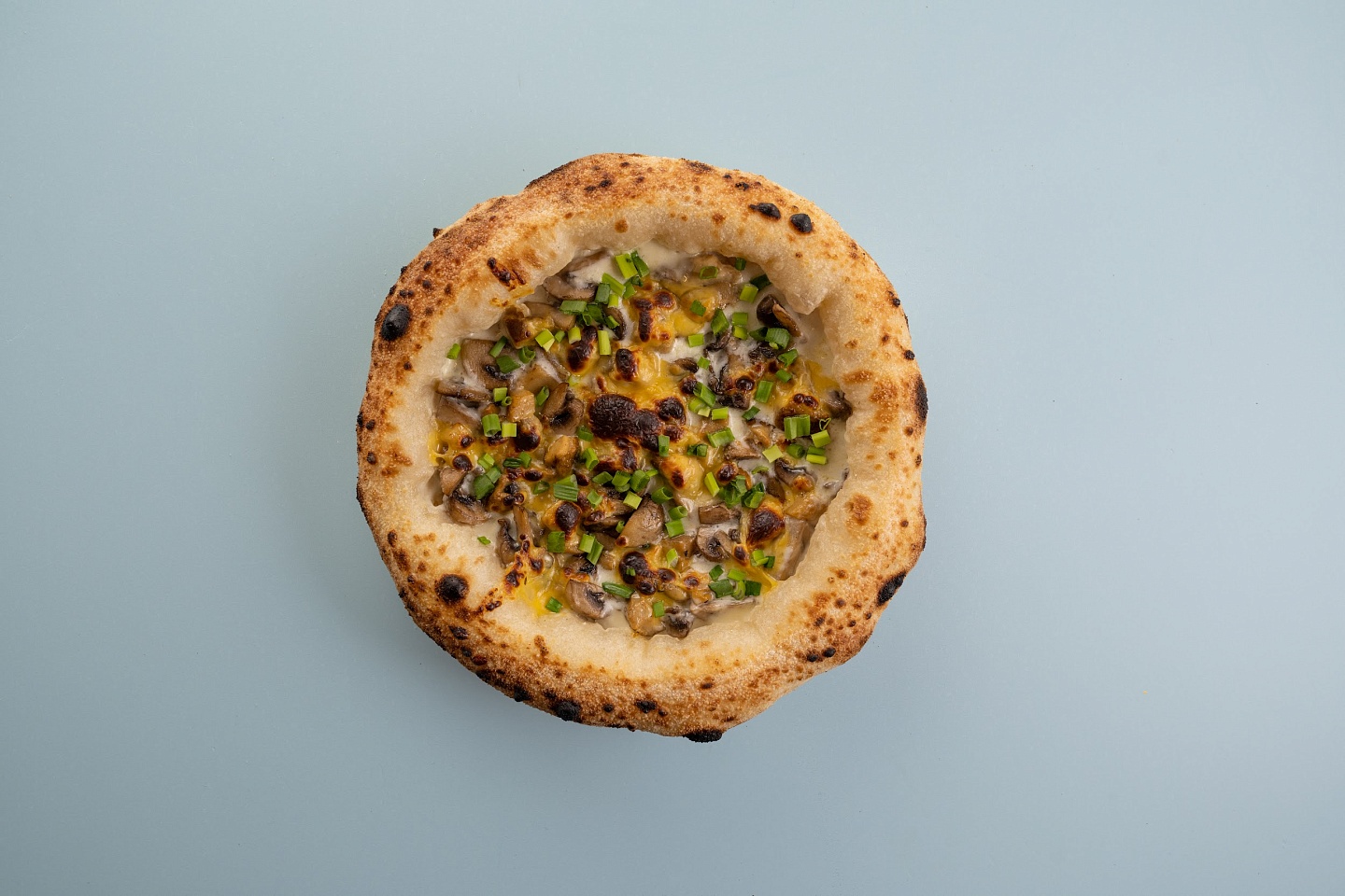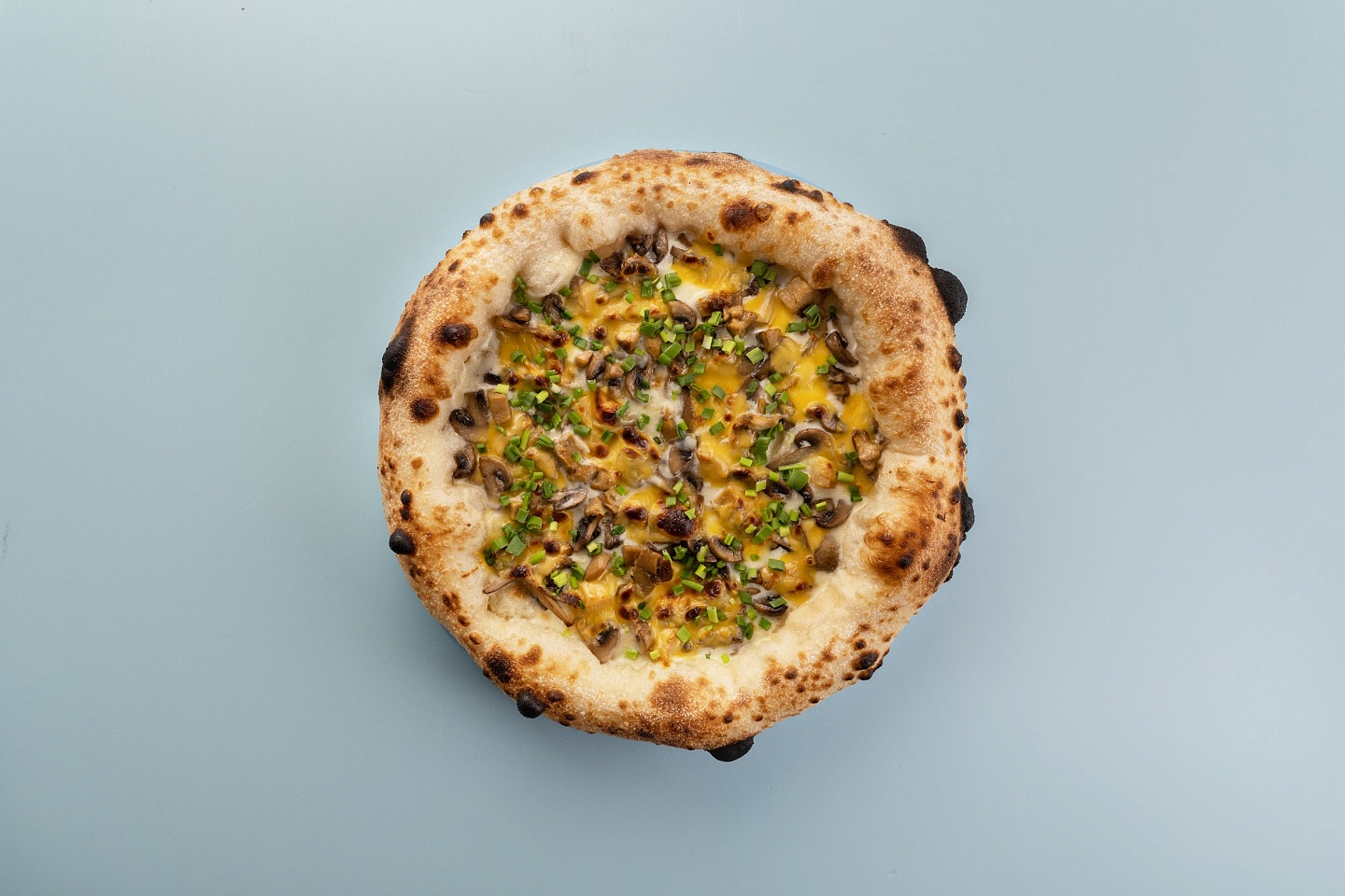 Вес: 380 гр Состав: тесто для пиццы, сливочный соус, моцарелла, белые грибы, шампиньоны, чеддер, зеленый лук
