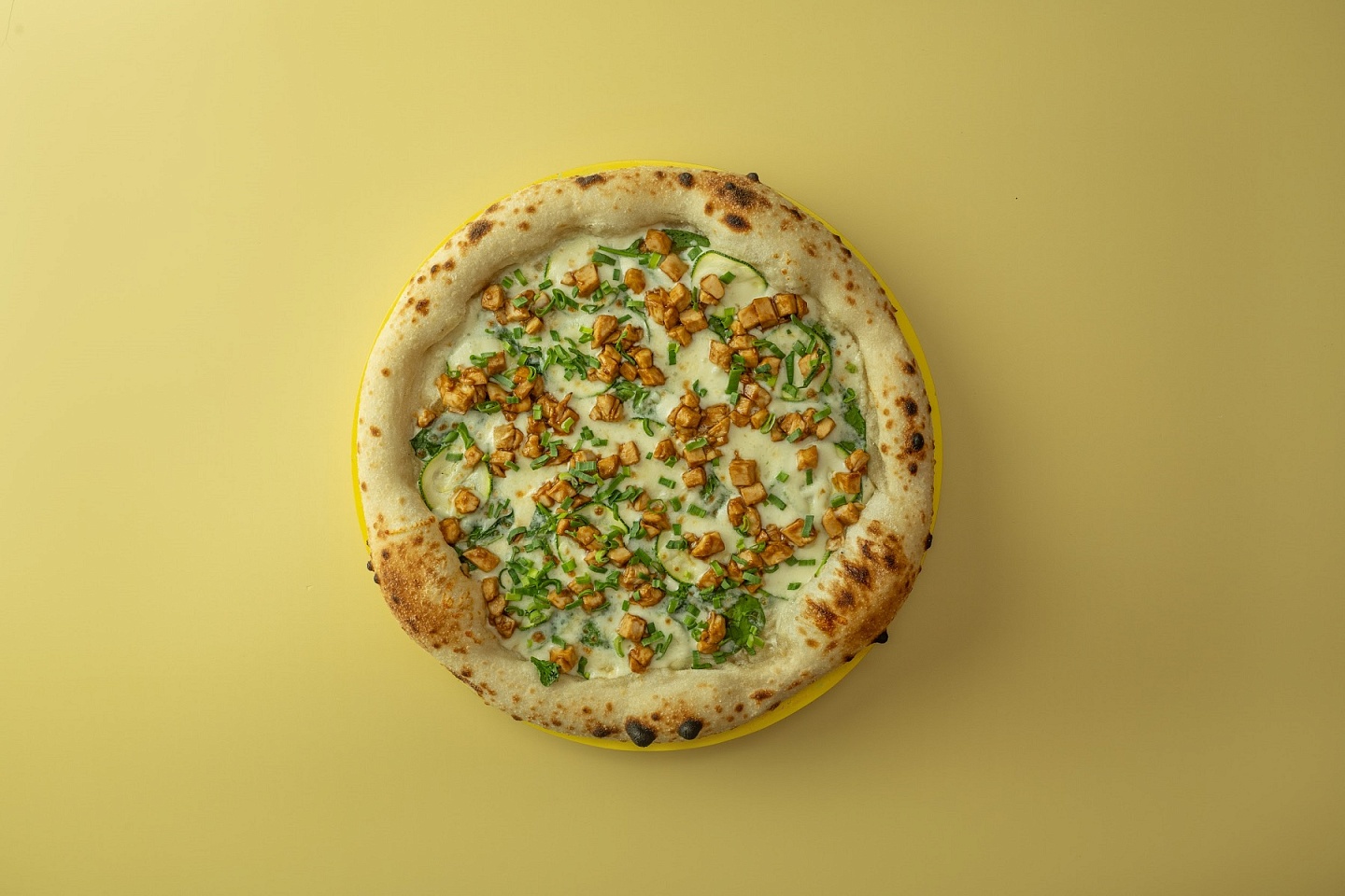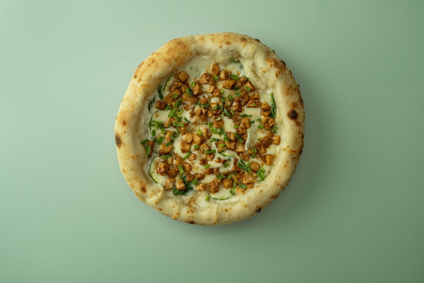 Вес: 350 гр Состав: тесто для пиццы, сливочный соус, моцарелла, куриное филе, соус терияки, шпинат, цукини, зеленый лук