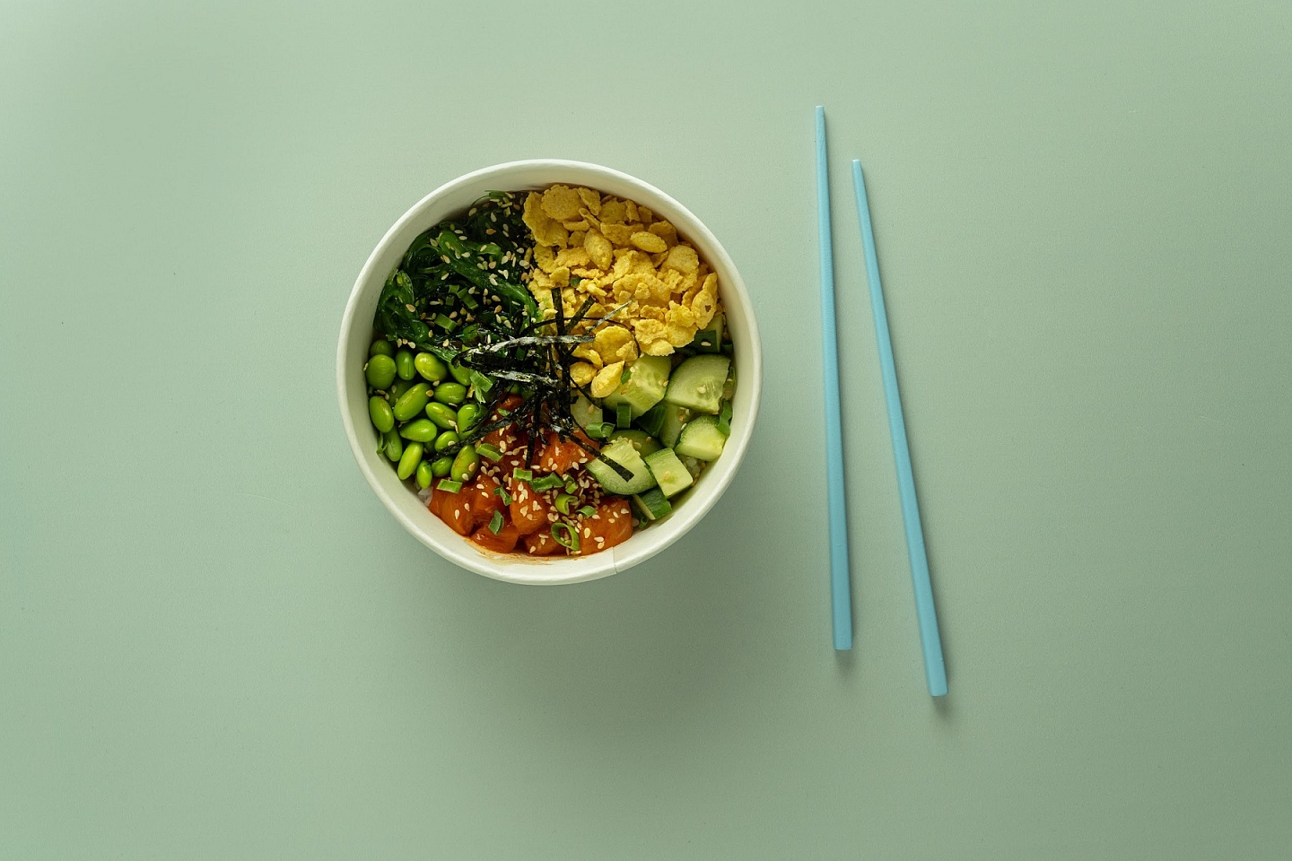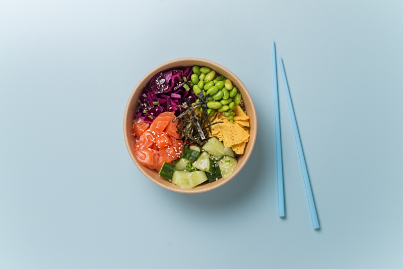 Вес: 350 гр Состав: рис, лосось, соус для поке, огурец, маринованная капуста, бобы эдамаме, начос, зеленый лук, нори, кунжут