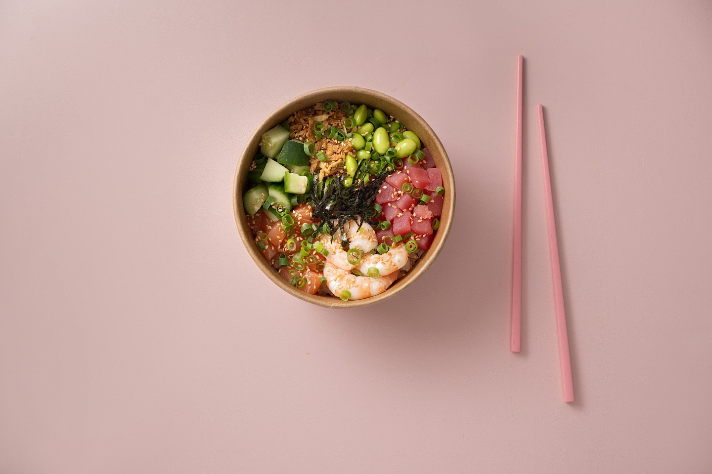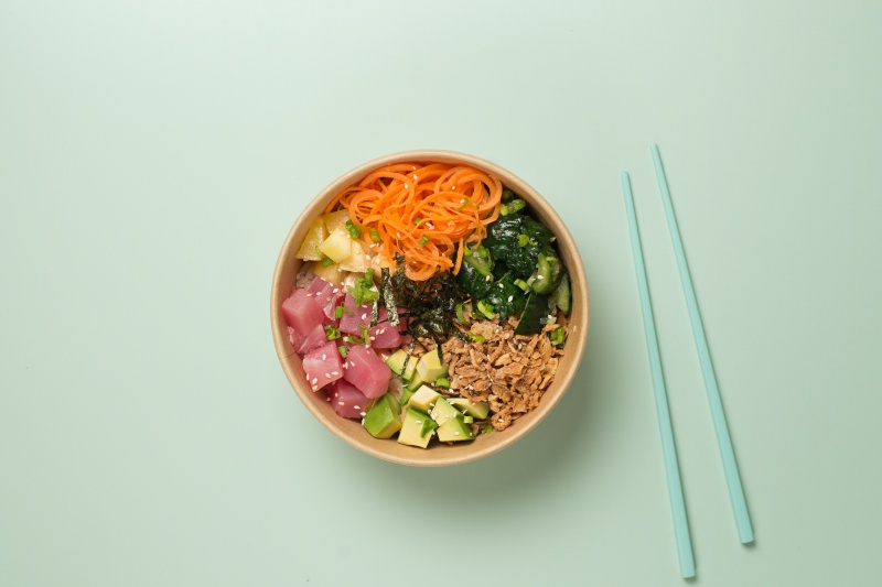Вес: 350 гр Состав: рис, тунец, соус для поке, битые огурцы, авокадо, морковь, манго, лук-криспи, зеленый лук, нори, кунжут