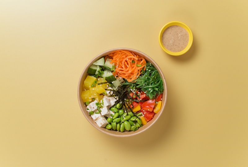 Вес: 390 гр Состав: рис, соус для поке, тофу, огурец, такуан, болгарский перец, чука, бобы эдамаме, морковь, нори, кунжут