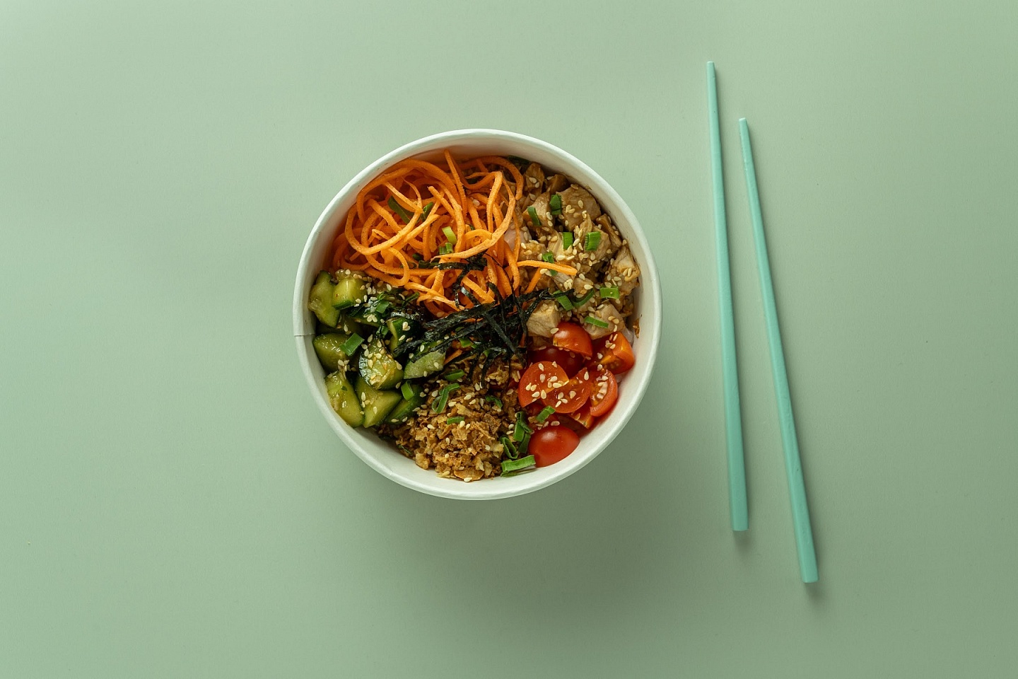 Вес: 330 гр Состав: рис, куриное филе, терияки соус, битые огурцы, черри, лук криспи, морковь, зеленый лук, кунжут, нори, соус для поке