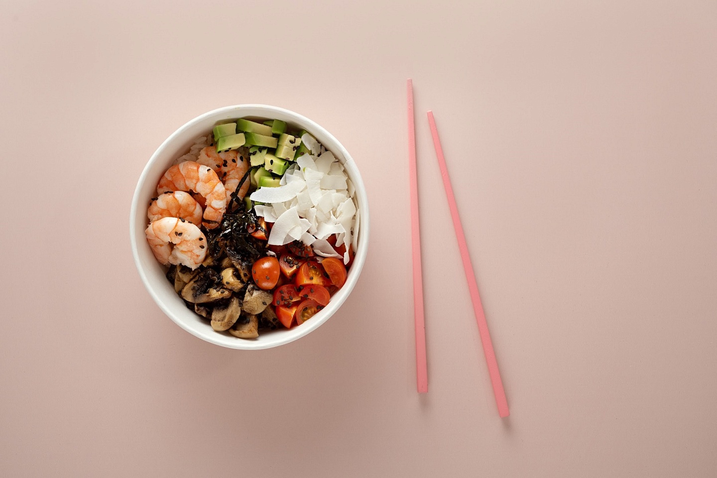 Вес: 320 гр Состав: рис, креветки, томаты черри, шампиньоны, кокосовые чипсы, авокадо, лук зеленый, кунжут, нори, соус для поке