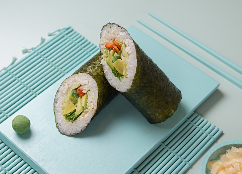 Вес: 350 гр Состав: рис, огурец, авокадо, болгарский перец, чука, айсберг, ореховый соус, зеленый лук, кунжут, нори