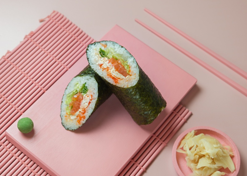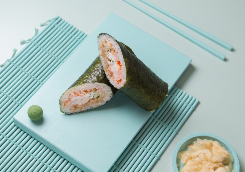 Вес: 340 гр Состав: рис, лосось, краб, сурими, тобико, айсберг, зеленый лук, нори