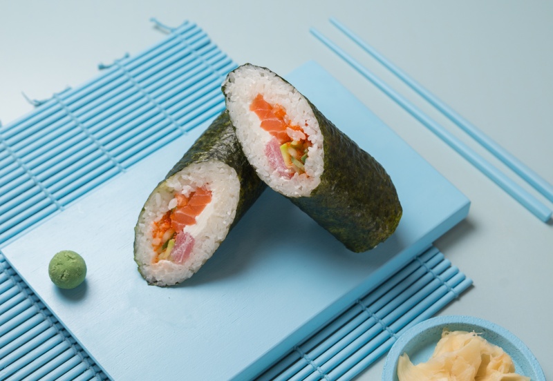 Вес: 350 гр Состав: рис, лосось, тунец, сливочный сыр, авокадо, огурец, нори