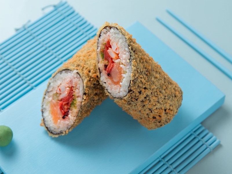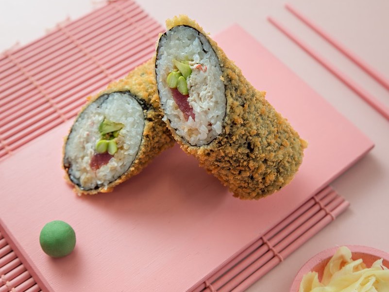 Вес: 390 гр Состав: рис, тунец, краб, сурими, эдамаме, авокадо, соус терияки, сухари панко, нори